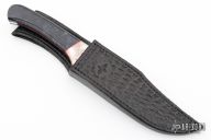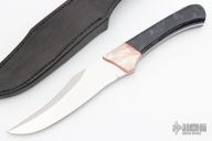 This Personal Bowie by Curtis J Jones features a mirror polished blade with false top edge, .183" blade stock and 1.438" blade depth, full tang construction. The handle has white pearlex bolsters, black pearlex scales with red liners and hidden pins. Comes with a hand tooled black leather sheath. Comes with a zippered case and COA dated 6-19-99. Excellent condition.