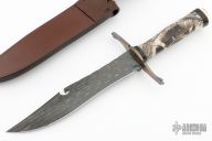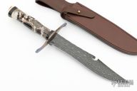 This custom fixed blade from Barry Dawson features a Damascus blade with fileworked spine and false top edge, .192" blade stock and 1.773" blade depth, hidden tang construction. The handle has a colored Damascus guard, stabilized cross cut mammoth ivory grip with mammoth ivory butt, kudu horn spacer. Includes a brown leather sheath and a zippered case. Excellent condition. made in 2020.