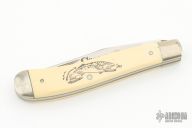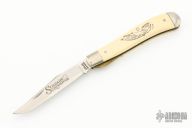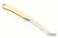 This knife by Schrade features a satin finished blade with a single nail nick. The handle has nickel silver bolsters, white paper micarta covers, brass liners and stainless steel springs. Has a few light scratches, otherwise excellent condition.