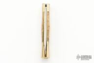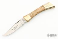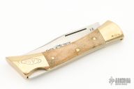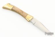 This lockback folder features a mirror finished clip point blade with nail nick. The handle has brass bolsters, front and rear, brass liners, and wood scales. Scuffs, scratches and oxidation is visible otherwise the knife is in okay condition.