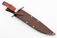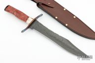 This custom fixed blade from Barry Dawson features a Damascus blade with fileworked spine and false top edge, .204" blade stock and 1.920" blade depth, hidden tang construction. The handle has a colored steel fileworked guard, maple burl wood grip with buffalo horn butt, stag spacer. Includes a brown leather sheath and a Velcro case. Excellent condition. made in 2020.