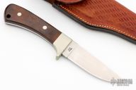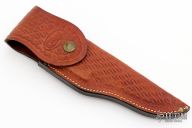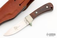This Hunter by Case features a satin finished blade with .107" blade stock and 1.383" blade depth, full tang construction. The handle has a nickel silver guard and dymondwood scales. Comes with a hand-tooled brown leather sheath. Has a few very light scratches, otherwise excellent condition. Pretty nicely made vintage Case knife!