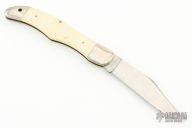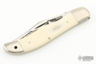 This knife by Case features a mirror polished blade with a single nail nick. The handle has nickel silver bolsters, nickel silver shield, brass liners and stainless spring.  Bone covers. Comes with a brown leather sheath. Has some light scuffs and scratches, great condition otherwise.