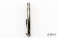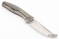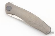 This knife by Shirogorov Knives features a tumbled blade with satin flats and a notched thumb rest and flipper tab.  The handle features a milled titanium frame with a blasted zirconium tip up pocket clip and backspacer.  Blade Steel: M398.  S/N 027/300.  Includes the original box and makers card. Has a couple light scuffs, excellent condition otherwise.