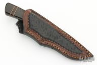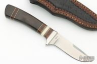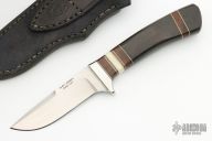This Hunter by Alan C Warren features a hand rub satin finished spear point blade with false top edge, .143" blade stock and 1.014" blade depth, hidden tang construction. The handle has a stainless steel guard, ebony wood grip, and black/nickel silver/ireonwood/walrus ivory/brass spacers. Comes with hand tooled brown/black leather sheath. Excellent condition. #2363