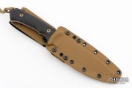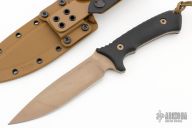 This Harsey - Difensa by Spartan Blades features a Flat Dark Earth coated spear point blade with swedge. The handle is comprised of 3D contoured canvas micarta scales over full tang construction. Exposed tang pommel with lanyard hole. Includes Coyote Brown kydex sheath with Blade Tech IWB loops, and nylon sheath. Has scuffs, scratches, and sheath marks on blade, but overall good condition.