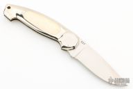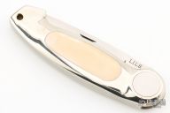 This Button Lock Folder from Jimmy Lile features a satin finished blade with nail nick, #037 on blade. The handle has a nickel silver frame with mammoth ivory inlays. Large button lock release mechanism used to open and close the knife. Numbered "99" on inside of backspacer. Has some a couple very light scratches, otherwise excellent condition.