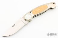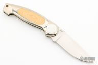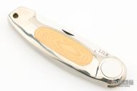 This Button Lock Folder from Jimmy Lile features a satin finished blade with nail nick, #067 on blade. The handle has a nickel silver frame with Westinghouse ivory paper micarta inlays. Large button lock release mechanism used to open and close the knife. Numbered "01" on inside of backspacer. Has some a couple very light scratches, otherwise excellent condition.