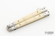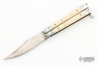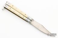 This balisong from the Philippines features a clip point blade with a satin finished blade.  The handle has aluminum bolsters, brass channel construction, white scales, aluminum T-latch. Has some light scratches and some cracks in the scales, otherwise good condition.