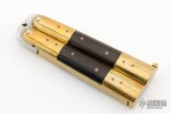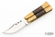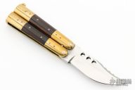 This balisong from the Philippines features a clip point blade with a satin finish. The handle has brass bolsters, front and rear and wood scales, brass channel construction, brass T-latch. Has some light scratches, otherwise excellent condition.