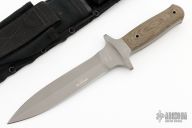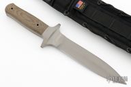 This is a full integral dagger, drop-forged out of one massive piece of 440C stainless steel. This technically challenging procedure guarantees the maximum in stability. You can't hold it in your hand without recognizing its unbelievable strength and sturdiness. A true masterpiece, both for the collector and the user. The fully double-edged 7" blade provides an impressive appearance. Carefully sculptured green canvas Micarta scales provide an excellent grip under all conditions. Comes with a black nylon sheath. Has some scuffs and scratches, otherwise good condition.