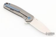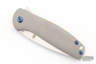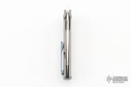 The build on this production model is superb. It has a bead blasted titanium handle with titanium back spacer, blue anodized pocket clip, blued hardware, and a steel lockbar insert. The full-flat ground CPM-S35VN steel blade is stonewashed and rides on a ceramic ball-bearing pivot. We're confident you'll enjoy the Gemini flipper!
