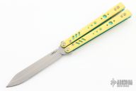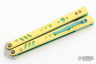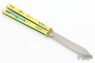 This BRS Replicant features a tumble finish drop point blade. The handle is comprised of yellow G-10 scales over anodized titanium liners and tumbled titanium backspacers. Stainless steel T latch included but not attached. Tip up 4-way reversible titanium clip. Comes with original box, zipper case, and papers and papers. The item is unused and in excellent condition.