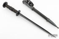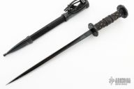 The long, straight triple-edged and hollow ground blade is incredibly stiff and terminates in a needle sharp point. The blade is richly blued, then the edges are hand polished, giving the Rondel its handsome appearance. The handle of the Rondel Dagger is turned and intricately hand-carved from Rosewood, with brass pins added to give further decoration and more traction to the grip.
