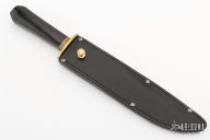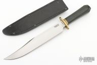 This Laredo Bowie by Cold Steel features a satin finished VG-1 San Mai blade with a nearly sharpened top edge, .294" blade stock and 1.608" blade depth, hidden tang construction. The handle has a brass guard and black linen micarta grip. Comes with black leather sheath and original box. Excellent condition.