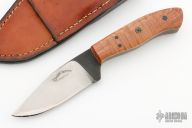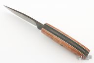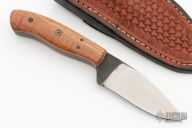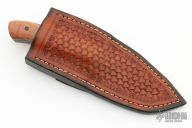 This knife by donald Lawson features a satin finished blade with black flats, .130" blade stock and 1.200" blade depth, full tang construction. The handle has wood scales with white and black wood liners, mosaic and micarta pins. Comes with a hand tooled brown leather sheath. Has some light scratches, otherwise good condition.