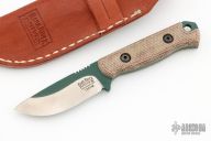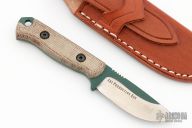 This Micro Bravo from Bark River Knives features a two-tone drop point blade with notched thumbrest, .139" blade stock and .724" blade depth, full tang construction. The handle canvas micarta scales. Includes a brown leather sheath. Marked "1st Production Run" on blade. Excellent condition.