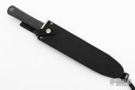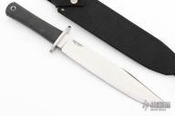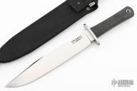 This Trail Master bowie from Cold Steel features a satin finished clip point blade with a false top edge, 5/16" blade stock and 1 1/2" blade depth, hidden tang construction. The handle has a stainless steel guard and a rubber handle. Comes with a nylon sheath with a belt loop and original box. Has a few light scratches, otherwise. Excellent condition.