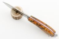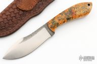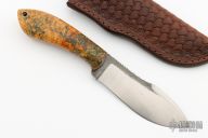 This Hunter by Bill Akers of Backwoods Custom Knives features a satin finished blade with full tang construction, .155" Blade Stock, 1.418" Blade Depth. The handle has dyed and stabilized burl wood scales with mosaic pins.  Includes a hand tooled brown leather sheath. Has visible temper line. Excellent Condition.