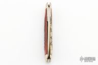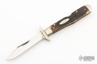 This Cheetah lock back folder from Case Knives features a clip point mirror polished blade with nail nick. The handle has nickel silver bolsters, front and rear, and swing guard, and the scales are jigged bone over brass liners. Has some light scratches, otherwise good condition.