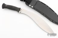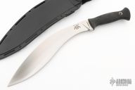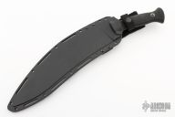 The Kukri blade, with its markedly downward curved blade, has long been identified with the Gurkha Warriors of Nepal, the ferocious mercenaries who have wielded this blade for over 150 years in the service of the British Empire. The Cold Steel Gurkha Kukri was inspired by Cold Steel President, Lynn C. Thompson’s close association with Dr. Maung Gyi, chief instructor of the American Bando Association, and a renowned martial artist with wide-ranging knowledge and skills. Under Dr. Gyi’s tutelage, Lynn gained insight into the full potential of the Kukri and learned it was not just a chopping weapon but a piercing, slashing, and smashing weapon as well. Smashing techniques allow the Kukri to function as a hammer or mallet or to deliver non-lethal blows in a self-defense role. A concentrated blow with the back of the blade can break bones or be lethal if directed at the head. With Dr. Gyi’s input, Thompson designed a longer, narrower point for the Gurkha Kukri with more distal tapering to the spine. This resulted in a thinner, sharper point which can be deeply driven into thick, tough targets with minimal effort. Finally a masterfully designed Kraton handle was added to maximize the blade’s fierce potential. Perfectly contoured and deeply checkered, it offers a superb non-slip grip and cushions the hand from the shock of the hardest blow. The Gurkha Kukri’s VG-1 San Mai blade will out-chop any factory or handmade knives; including swords twice its size, even expensive, hand forged Japanese Katanas. It’s the heaviest Kukri on the market. The blade is almost an inch wider near the tip than at the handle, shifting the knife’s balance point forward to allow a substantial blow to be struck with minimal effort, using inertia alone to complete the cut. Each Gurkha Kukri is supplied with a black Secure-EX sheath to protect the blade and allow you to wear it safely and securely on your side always ready to defend you and your loved ones. Has a few light scratches from the sheath, otherwise excellent condition.