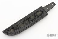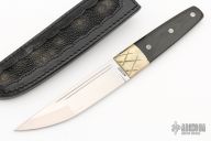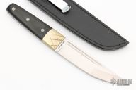 This Konjo II features a high polish "long sword point" VG-1 San Mai blade with false top edge, 1/8" blade stock, 1 1/8" blade depth. Full tapered tang construction with nickel silver dovetailed bolsters and polished black micarta handle. Includes black leather sheath and original box. Discontinued model. Has some light scratches, and patina on the bolsters, otherwise excellent condition.
