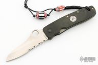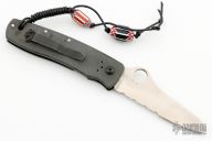 This Bob Terzuola designed knife from Spyderco has a satin finish partially serrated edge blade and black aluminum scales. Clip is interchangeable to up or down positions according to user preference. Has some scuffs and scratches, otherwise good user condition.