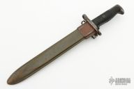 This WWII Era M1 Garand Bayonet from United Cutlery features a spear point blade with fuller. The handle is comprised of a stainless steel guard and black handles over steel tang. Includes fiberglass sheath with steel throat. Rust on guard, pommel and sheath. Pitting and scratches on guard and blade. This piece of history definitely shows it's age.