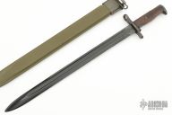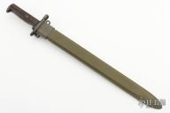 Made by Rock Island Arsenal in 1911, when this bayonet was made it would have had a bright polished blade. When the US entered WWI, the blades were ordered blackened. The metal has the parkerised finish used during this period and is in excellent condition with some very minor blemishes only. The grips are wood, in excellent condition, and are affixed to the handle by a single screw. The scabbard is the M3 pattern which is of WWII production. The scabbard is in very good condition with some ware.