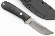 This is a K-17 White River Skinner by Dozier Knives features a satin finished blade with .134" blade thickness and 1.030" blade depth, full tang construction. Black linen micarta scales with aluminum pins. Right handed kydex horizontal sheath. Brand new from maker.