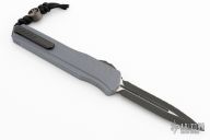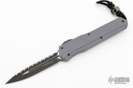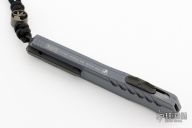This Cypher OTF is a collaboration between Anthony Marfione and DC Monroe. It features a black fully serrated blade with satin flats and notched thumbrest. The handle has a grey anodized aluminum handle with all black hardware, and a black titanium tip down clip and an anodized titanium insert at the butt with lanyard hole. Comes with original box and papers. Excellent condition. 10/2018 and #0848.