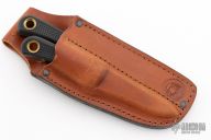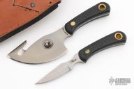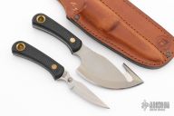 This Combo set from Knives of Alaska features two knives. A gut hook skinner and a caper. All knives feature a bead blasted D2 steel blade with suregrip scales over full tang construction. Includes brown leather double sheath with belt loop. Has some cuts in the sheath, otherwise excellent condition.