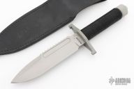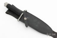 This Apparo Survival Knife by Boker is an Ed Martin design, features a spear point blade with sharpened top edge and sawteeth along the spine. The handle is comprised of a double guard with thread wrapped handle over hollow tang construction with a threaded removable butt cap. Includes leather sheath with belt loop and original box. Has some light oxidation spots, otherwise good condition.