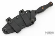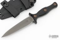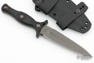 This Raider Dagger by RMJ Tactical features a sniper grey cerakoted double edged blade with fullers, .215" blade stock and 1.152" blade depth, full tang construction. The handle has black G-10 scales with hollow flanged pins, notched on tang of blade. Comes with a kydex sheath with belt loops. Comes with original box and papers. Excellent Condition.