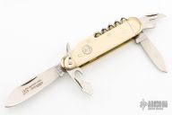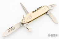 This knife by Boker compromises of 6 unique components: two blades, a can opener, cap lifter, leather punch, corkscrew and flathead screw driver. The handle is composed of white sclaes and nickel silver bolsters with brass liners. Comes with original box and papers. Excellent Condition. #36 of 300