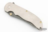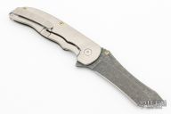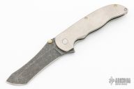 This Norseman (#6683) by John Grimsmo features an acid etch blade with a single titanium thumb stud, notched thumb ramp and flipper. The handle features tumble finished and crosshatch textured titanium frame with titanium screws. Very smooth action that requires no wrist movement. Nice detent, lockup and blade seating. Rides on ceramic bearings. Comes with original custom hard case, Nano-Oil, tool, and COA dated July 14, 2022. Knife is in excellent condition, shows no signs of use or carry.