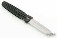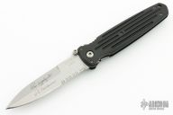 This Applegate Fairbairn Combat Folder by Gerber has a bead blasted stainless steel partially serrated spear point blade with dual thumb studs and false top edge. Handle is black contoured polymer with single stainless steel liner and lanyard hole. Excellent condition.  Comes with original nylon sheath.