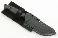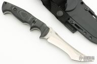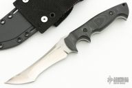 This Rampage is an RJ Martin design executed by Boker. It features a satin finished recurved, upswept tanto style blade with swedge and notched thumb ramp 0.176" blade stock and 1.12" blade depth. The handle is comprised of contoured black linen micarta scales over full tang construction. Lanyard hole in pommel. Includes kydex sheath with belt loop and original box. Has some light opts on the blade, otherwise excellent condition.