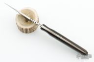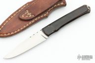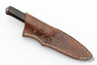 This knife from Wayne Valachovic features a satin finish drop point blade with a file worked thumbrest, .152" blade stock and .845" blade depth, full tapered tang construction. The handle has cocobolo scales and a lanyard hole at the butt. Comes with a hand tooled brown leather sheath. Has a few light scratches, otherwise good condition.