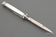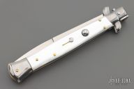 This Swivel Bolster by Frank Beltrame features a polished bayonet ground 4mm blade with false top edge. The handle has stainless steel bolsters, front and rear, pearlex scales, brass liners, stainless spring. Excellent condition.