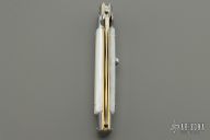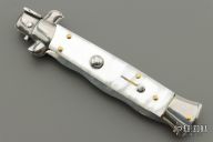 This Swivel Bolster by Frank Beltrame features a polished Kris ground blade with false top edge. The handle has stainless steel bolsters, front and rear, pearlex scales, brass liners, stainless spring. Excellent condition.