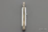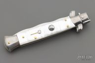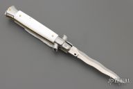 This Swivel Bolster by Frank Beltrame features a polished Kris ground blade with false top edge. The handle has stainless steel bolsters, front and rear, pearlex scales, brass liners, stainless spring. Excellent condition.