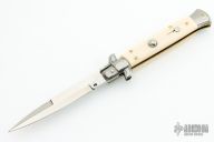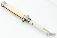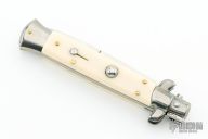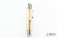This Swivel Bolster by Frank Beltrame features a polished bayonet ground 4mm blade with false top edge. The handle has stainless steel bolsters, front and rear, imitation ivory scales, brass liners, stainless spring. Excellent condition.