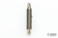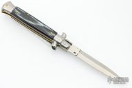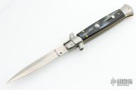 This Swivel Bolster by Frank Beltrame features a polished dagger ground blade with false top edge. The handle has stainless steel bolsters, front and rear, imitation buffalo horn scales, brass liners, stainless spring. Excellent condition.
