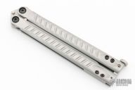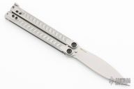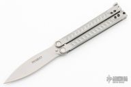 This 5500 Kimura Balisong by Bradley Cutlery has a bead blasted Sandvik drop point blade. Handle is bead blasted 410 stainless steel with T-Latch closure. Excellent+ condition. Comes with original box and papers.