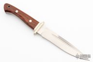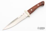 This Special Fighter by Ichior Hattori features a satin finished hollow ground recurve blade with fullers and false top edge, .199" blade stock and 1.160" blade depth, full tang construction. The handle has a nickel silver guard and cocobolo scales with a lanyard hole. Comes with original box, sheath and papers. Excellent condition.