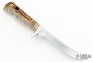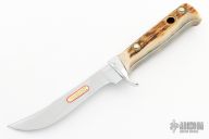 This Hunter's Companion by Puma features a satin finished upswept blade with false top edge, notched thumbrest and a full tang construction, .128" Blade stock, .799" blade depth.  The handle has an aluminum guard and stag scales. Includes original box, papers and brown leather sheath. #44074. Excellent condition.