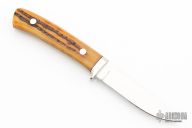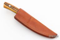 Wayne sold his first knife in 1985. "I am a one-man shop and make a limited number of knives per year. I use ATS 34 (154 cm) which is professionally heat treated to a Rockwell C Hardness of 58-60. Handle materials, such as stag, desert iron wood, African blackwood and curly/birdseye maple, when stained with chromic acid, are some of the better natural handle materials. All knives come with sheaths made from 9-10 oz. vegetable tanned leather. I make all sheaths and then wet form them to each knife. After the sheath is dry, it is dipped in oil and harness dressing to protect it from moisture and to help maintain its fit to the knife."