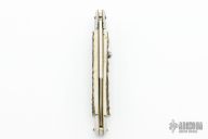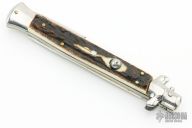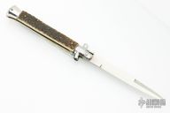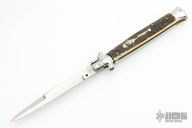 This Swivel Bolster from Stiletto Italy features a tumble finished bayonet ground blade with false top edge. The handle is comprised of stainless steel bolsters and pommel with stag scales over brass liners and stainless steel backspacer. Has a few scratches, otherwise excellent condition.