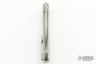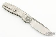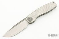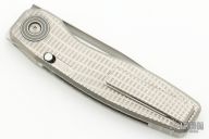 This FSD by Craig Brown Knives features a drop point stonewashed blade and notched flipper and fullers. The handle has a tumbled titanium frame with milling style #1, titanium tip up clip and backspacer. Nice detent, action, blade seating and lock up. Comes with original hard case with certificate #072. Excellent condition.